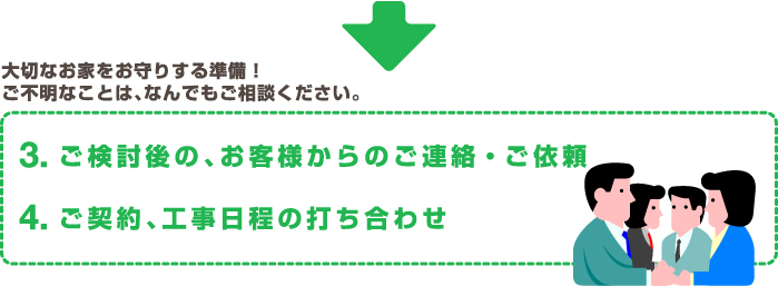 ですので、しつこく営業をかけたり無理強いで工事をお願いすることはしません。お客様のご都合のよいときに工事をさせていただきますし、また、費用の事に関しても、可能な限りご状況に合わせた工事をさせていただきますので、遠慮なくおっしゃってください。