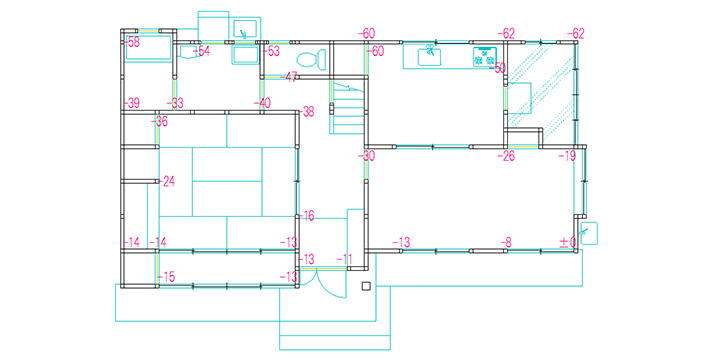 施工前の家の傾きの状態では、図面上側に向かって大きく沈下して家が傾いている状況でした。キッチン、やトイレ、風呂などの生活空間が多く集まっていることもあり生活上傾きが気になる状況でした。